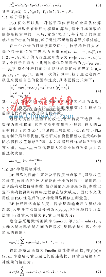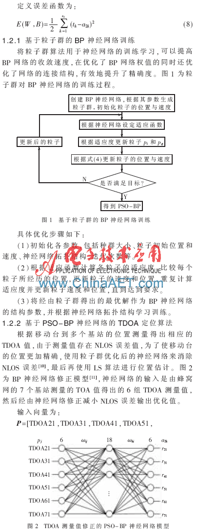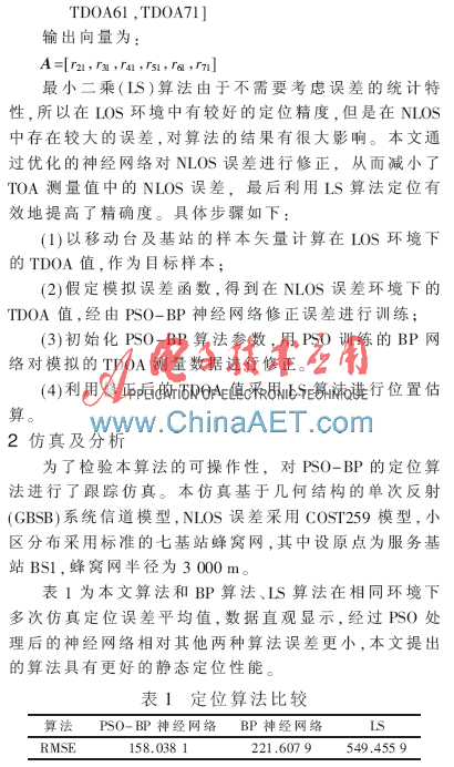 BP神经网络是一种前向型反馈神经网络,在反向传播的算法中通过改进的PSO合理迭代确定。参考文献[1-2]利用基站的坐标通过定义残差函数,对定位结果进行加权得到移动台的位置,参考文献[3]提出了迭代次数更少,收敛速度更快的改进的粒子群优化算法,参考文献[4]提出了一种利用BP神经网络模型对NLOS误差的修正。本文结合粒子群优化算法和BP神经网络的特点,利用了网络的学习特点和粒子群的跟踪遍历迭代寻找最优解,修正NLOS误差之后,再通过测量值TDOA使用LS算法进行位置估计。跟踪仿真验明该定位算法有较高的精度。