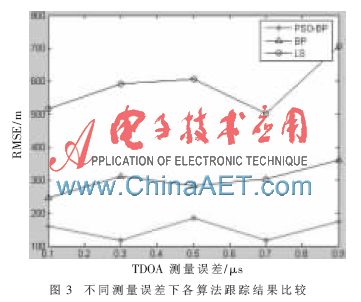 图3为在不同的测量误差下本文算法与其他常用算法的跟踪比较结果。随着测量误差的增加,几种算法的定位性能都有一定程度的降低。从定位效果上看,本文算法有较好的稳定性能,明显优于BP算法和LS算法。说明PSO-BP对于误差的增大有较好的适应性。