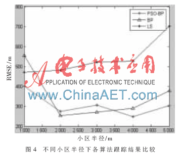 图4为在不同小区服务半径下本文算法与其他常用算法的跟踪比较结果,纵坐标为各个算法跟踪结果的均方误差值。由于半径的增加,BS和MS之间的距离有所增大,导致NLOS误差增加,所以定位精度下降。由图看出,本文PSO-BP算法在不降低BP网络学习能力的情况下具有更好的稳定性。