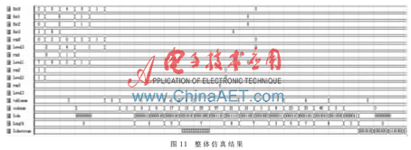从图11中可以看出,本设计一个时钟内读出4个量化数据Out0~Out3,并且根据Out0~Out3中非零个数完成游程编码,完成了本文中的并行zig-zag扫描的设计目标;码表切换、组合逻辑查找和指数哥伦布编码按照本文设计的流水线结构进行。此外,码长确定器的输出Length正确,完成了本文中码长确定器的设计目标,可直接从读出的码字进行位数的判断。