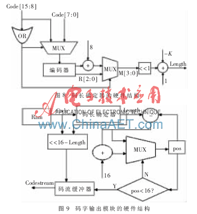 在码字输出时,熵编码将各种信息以二进制的形式逐个比特写入码流,最终以字节为单位进行封装,这样会增加运算时间,使得编码效率极低[10]。本设计中采用双字节为单位写入码流,极大地加快了熵编码速度。实现方法:将完成编码的码字Code存储到宽度为16的Ram中,设置一个32 bit的码流缓冲器,变量pos表示码流缓冲器中有效码字的位置,初始值为31,在有效码字数大于或者等于16(即pos<16)时,码流缓冲器左移输出16 bit数据Codestream,然后pos加16。变量Length表示输入到缓冲器中码字的位数。输出模块的硬件结构如图9所示。