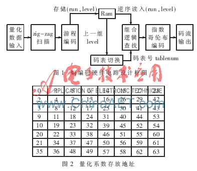 AVS熵编码硬件设计包括量化数据输入、zig-zag扫描、游程编码、码表切换、组合逻辑查找、指数哥伦布编码和码流输出7个模块,电路框图如图1所示。