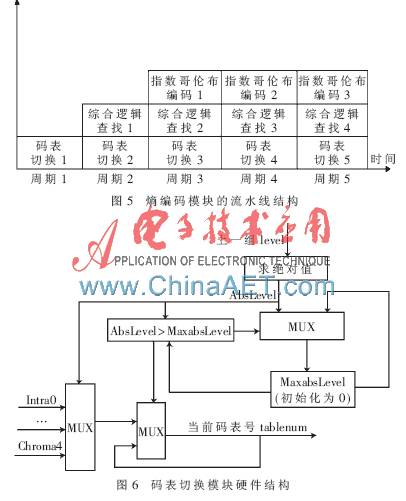 本设计中将码表切换、组合逻辑查找和指数哥伦布编码设计成流水线结构,同时这种硬件结构也节省了大量存储中间结果所需要的空间。流水线结构如图5所示,图中的1~5表示第1~5组(run,level)。