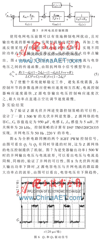 为了使输出的并网电流稳定,减小电流的突变波动,本文以恒定Z源电容电压控制策略,进而恒定输出电流控制。交逆变侧以电容电压闭环反馈控制实现电容电压的恒定,电容电压误差经过PI控制器调节后得到并网期望电流,与电压同步控制信息得到电流控制器期望电流。电流控制器采用的是电流闭环加电压前馈跟踪控制法,结构框图如图5所示。图中是并网期望电流,iac是并网实际电流。TS为开关周期,Gc(s)是电流控制器,GINV(s)是功率逆变器,GL(s)是输出滤波环器。