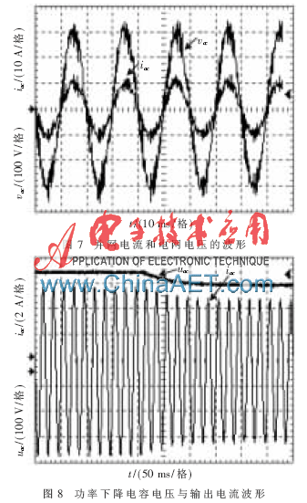 输出电流也跟踪电容电压下降,但下降速度缓慢且平滑。在不同阶功率点之间改变时实现了输出电流的平滑过渡。由图7与图8进一步分析可得出,在功率稳定期输出电流恒定且无畸变,验证了恒定电流控制策略的可行性。