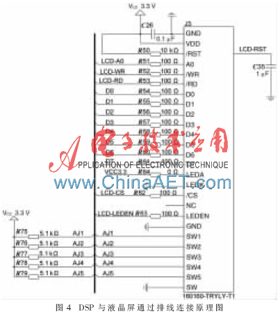 利用DSP的GPIO,通过排线连接到液晶屏幕,以显示采集的模拟量以及设置参数。电路原理图如图4所示。图中液晶屏需要TPS767D301提供的DC 3.3 V电源电压供电,利用电阻、电容组成的振荡电路,连接引脚3,系统上电为电容C35充电,此时引脚3为低电平,液晶屏复位启动;C35充电完毕,引脚3即为高电平,液晶屏完成启动;利用DSP一组GPIO引脚连接液晶屏(如图中的D0~D7),作为数据传输使用,并且单独引出LCD_CS引脚作为液晶屏的使能端,DSP输出2个周期低电平而后变为高电平,使能液晶屏;再利用GPIO外接5个按键开关,另一端连接DC 3.3 V,设计了5个按键,其中4个方向选择键,1个确认键。