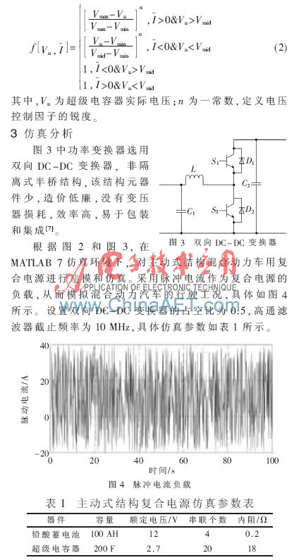 本文引入了一种改进型滤波器功率分流的控制策略,在MATLAB 7仿真环境下主动式结构复合电源进行建模和仿真。由仿真结果不难发现,主动式结构复合电源的功率输出能力大大提高了,蓄电池的输出电流曲线更为平滑;超级电容器在满足负载电流不断变化的同时能稳定工作,起到了辅助电源的作用。