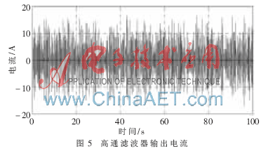 图5为脉冲电流负载经过高通滤波器的输出电流图,负载电流中的高频分量主要由超级电容器辅助储能系统承担,因此该电流也即超级电容器辅助储能系统的参考电流。这里要注意的是高通滤波器的输出电流是未加超级电容器控制因子f和线性修正项a·(Vu-Vmid)的输出电流。