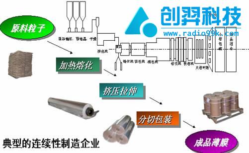 包装行业生产线一般为连续的,属于标准的连续型生产企业,企业的生产原料主要为塑料粒子及其相关的添加剂,粒子经过高温、高压熔融挤出后形成薄膜或片材,薄膜大卷一般需要进行再次的分切和包装后才能形成最终的成品,具体示意图如下: