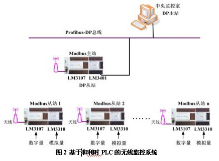 针对传统控制系统存在的缺点,我们提出了基于和利时公司小型一体化PLC HOLLiAS-LEC G3的无线解决方案。该方案的系统结构如图2所示。与传统通讯方案相比,该方案在现场设备和中央监控室间采用了无线通讯方式,具有传输距离长、可靠性好、抗干扰能力强、节省电缆、维护成本低等优点。