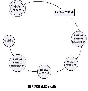 RTU协议,所以上位与下位LM3107之间采用Modbus通讯。上位的LM3107再通过LM3401DP从站模块与中央监控室进行数据交换。