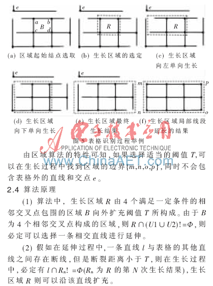 (4)迭代横线集U1与竖线集U2中的线段,若线段L与生长区域相交,则R区域向线段L扩充直至L末端为止,形成新的R区域,返回步骤(3)进行新生长区域的选定;若不存在L与生长区域相交,则跳转至步骤(5)。图5(c)、图5(d)、图5(e)所示为表格生长区域的生长过程。