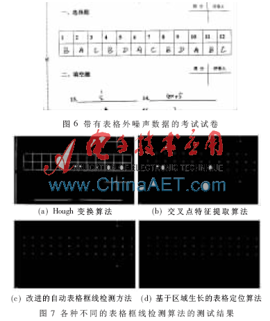 对带有表格外噪声数据的考试试卷(如图6所示)运用不同表格框线检测算法进行表格数据定位。分别通过Hough变换表格框线检测算法[8]、交点特征提取算法[9]、由郑秀清等人提出的一种改进的自动表格框线检测算法[10]和本文提出的基于区域生长的表格定位算法得到的结果如图7所示。