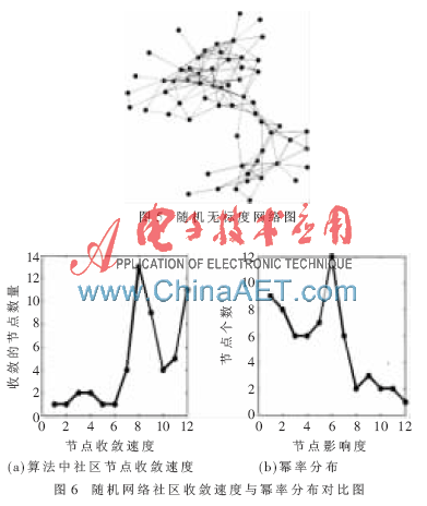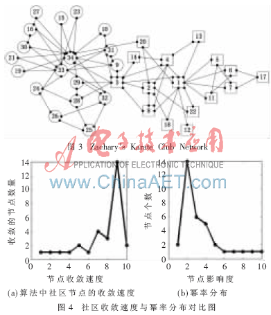 在实验过程中,对该网络节点用1~62进行了随机的标注,通过应用密度分布社区发现算法,成功地将社区分成了两个部分,社区收敛速度与幂率分布对比如图6所示。