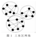 所谓社区,是指具有共同兴趣、爱好的人或者学有专精的专业人士,通过一定的方式聚集在一起,彼此之间可以沟通、交流、分享相关信息。在现实世界中,存在着很多这样的社区,例如社会关系网络[1]、神经网络、食物链网络、城市交通网络等。在这些社区中,有着复杂的内部结构,用节点表示实体,用连线表示实体间的联系,社区内部节点之间的联系非常紧密,社区之间的联系相对稀疏。近几年,随着网络的急速发展,网络社区也成为一个研究热点,同时取得了很重要的进展,并且发现了网络社区的很多特点,其中包括小世界特性(即网络中节点之间的平均距离很短,对数依赖于网络中的节点数)、无标度特性(即网络中节点的度分布右偏斜,具备幂函数或指数函数的形式)、聚集性或网络传递性以及社区结构特性,大量实证研究表明,许多网络是异构的,即复杂网络不是大批性质相同节点的随机连接,而是许多类型节点的组合,其中相同类型的节点存在较多的连接,而不同类型节点的连接则相对较少。把同一类型节点以及这些节点之间的边所构成的子图称为网络中的社区。社区如图1所示,图中的小型网络中包含3个社区,对应图中的3个椭圆,在这些社区内部,节点与节点之间的联系非常紧密,而社区之间的联系则比较稀疏[2-4]。