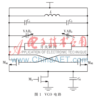 本设计的VCO电路采用NMOS交叉耦合差分对管电路,其具体电路结构如图1所示。使用NMOS管做为尾电流管,其谐振电路由L、C1、C2、MN1、MN2和VAR1、VAR2以及开关阵列组成。开关阵列是由3组开关控制不同的电容组成,实现8根调频线。
