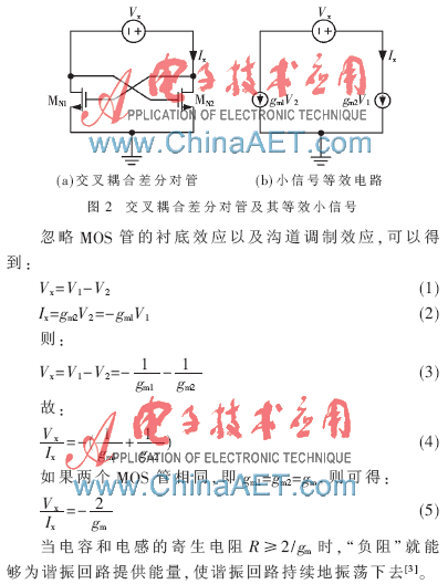 实际电路中都是由有源器件提供“负阻”。在压控振荡电路中,一般使用交叉耦合差分对管提供“负阻”。图2(a)所示为使用NMOS管组成的交叉耦合对差分管,其交流小信号等效电路如图2(b)所示。