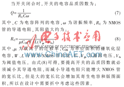 该开关阵列结构使用了3组开关,可以产生8根跳频曲线,大大地提高了频率变化范围。根据其可变电容的调谐范围以及频率计算公式可以得到每个开关结构中电容值的大小。其电容使用的是MIMCAP,该电容具有较小的容值和较高的Q值。