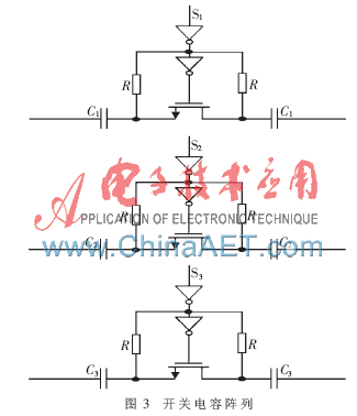 考虑到只使用上述可变电容的情况下,其电路的调谐频率较小,而且在集成电路工艺的制造过程中由于工艺偏差、版图寄生等情况会导致频率范围的偏移,所以本设计采用了如图3所示的开关电容阵列,以实现较大的可调范围。
