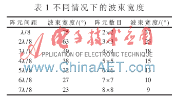 当基阵的阵元数目变化时,基阵指向性也随之改变。以阵元间距为d1=d2=λ/2进行仿真讨论,由仿真可知,当采用2×2基阵时,指向角最大且没有旁瓣产生;采用3×3基阵时,基阵指向角减小且有1个较小旁瓣产生;采用4×4基阵时基阵指向角进一步减小,旁瓣数量不变但幅度增大;采用5×5基阵时,基阵指向角最小,旁瓣幅度进一步增大,数量增加到2个。因此,在阵元间距一定的情况下,逐渐增加阵元个数时,基阵指向角逐渐减小,旁瓣逐渐产生且其幅度和数量不断增加,但增加的趋势在减小。表1为不同阵元间距和不同阵元数目时的波束宽度。