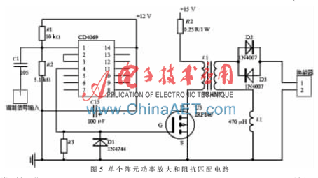 图5中功率放大电路由IRF840单极型MOSFET和脉冲变压器构成。 电路中, 已调信号经CD4069升压到+12 V后输入到IRF840的栅极,控制MOS管的导通和关断来产生高压脉冲信号。对已调信号进行升压的目的是保证MOS管可靠导通。
