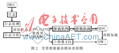 需要实时更新到动态数据仓库中的数据首先必须被变更数据捕获进程抓取,实现变更数据实时捕获的方式如下[3]。