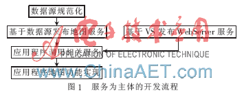 整个软件基于B/S架构开发,因此如何合理发布、配置和调用服务自然而然成为整个开发过程的核心工作。在整个开发过程中主要涉及到地图服务和WebServer服务两大类,基于ArcGIS Server发布的不同种类的地图服务是电子地图展示功能实现的基础,基于VS2010发布的WebServer服务是对客户端管理员信息处理的后台服务。服务为主体的开发流程如图1所示。