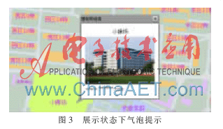 气泡是一种把业务数据和地图结合在一起的有效方式[2]。地图控件(Map)提供了一个infoWindow属性用来在地图上显示气泡信息,气泡内容通过其infoWindowContent属性控制,标题则是由其infoWindow属性下label次级属性控制。软件中的气泡提示格式是对气泡内容进行了定制(自定义LabelDataRenderer组件,包含建筑物名称、建筑物图片和相关网址链接3部分内容,数据源则是通过对FeatureLayer服务图层查询得到,并在LabelDataRenderer实例加载时对实例属性初始化),每次触发气泡提示实际上是目标建筑物对infoWindow的infoWindowContent属性重新赋值;建筑物气泡提示包含了两种类型:展示状态下气泡提示和管理员编辑状态下气泡提示。管理员登录后可以对建筑物气泡属性进行编辑并直接保存到后台GIS服务器,如图3所示。
