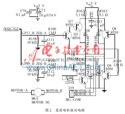 直流电机驱动电路如图2所示。直流电机控制使用了H桥驱动电路[3],控制口线为GPB0、GPH9(GPG0与GPH9为连接S3C2410A核心板时的引脚连接,图中标出的是连接S3C2410A核心板的引脚编号)。JP17可以断开直流电机控制电路与S3C2410A的连接。当GPB0输出高电平时(即ZDJ_A点为3.3 V),则Q2、Q3导通Q6导通MOTOR_B点为MGV+,Q6导通,MOTOR_A点为GND,此时直流电机将会正转。由于Q6的集电极通过一个二极管D7连接到H桥的另一个控制端ZDJ_B,将ZDJ_B控制端电压钳在1.0 V以下,因此不管GPH9输出是高电平还是低电平,Q4、Q5都会截止Q8截止,不会造成H桥短路故障。当GPB0输出为低电平(即ZDJ_A点为0 V)时,则Q3、Q6截止,Q7截止,GPH9的输出电平可以控制电机反转或停机。若GPH9输出高电平(即ZDJ_B点为3.3 V),则Q4、Q5导通Q8导通MOTOR_A点为MGV+,Q5导通MOTOR_B点为GND,此时直流电机将会反转。当GPH9输出低电平时,Q4、Q5都会截止Q8截止,电机停机。二极管D8~D11为续流二极管,用于释放电机线圈上产生的反电动势。电阻R162、R163为限流/保护电阻。PWM0输出信号通过一个电阻连接到一个电容上,信号通过R82和C127进行滤波,从而实现一个简单的DAC控制电路,将输出连接接到直流电机驱动电路,从而实现直流电机驱动[4]。