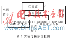 测试3 选用0.02级2003多功能标准表运用标准表法同本文研制的电参量分析仪进行电压、电流、功率、电能、功率因数、频率以及相位比对的参数。根据电压并联,电流串联的方式连接一起。实验连接框图如图3所示,以下实验连接方法原理与此连接图一致。