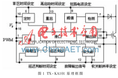 TX-KA101是北京落木源电子技术有限公司生产的专用于IGBT驱动的单管大功率集成芯片,它具有驱动延迟时间小(小于0.6 μs)、工作频率高(可达80 kHz)的特点,驱动输出正电压+14.5 V,负电压-8.5 V,保证可靠的关断且避免了干扰。此外,它还具有工作效率高、发热量小、外围电路简单、保护参数齐全、使用方便等优点。