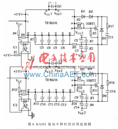 全桥连接可在半桥连接的基础上再增加2个KA101进行驱动,其驱动电路图同图6。