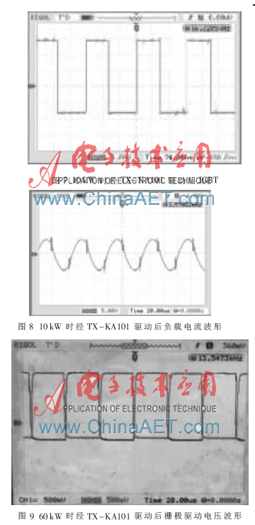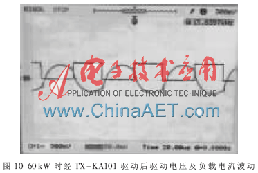 图7~图10为10~60 kW时IGBT栅极驱动电压及负载电流波形,图7、图8为KA101在某一钢铁企业中的实测波形(半桥),图9、图10为KA101在某矿山企业的实测波形(全桥)。可以看出电压、电流大致都保持反相位,系统可得到最大的功率输出,且电流波形近似为规则的正弦波。由于切换频率己经很接近谐振频率,开关器件的状态转换为准谐振开关状态,即IGBT的开通发生在零电压状态,关断发生在零电流状态。在这种情况下,可以看出TX-KA101单管驱动芯片能很好地驱动IGBT,且发热量小,在过流时也能很好地保护IGBT不被损坏。