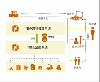 整个系统包括三个层次:最底层的IT基础设施(服务器、网络设备、存储设备、数据库等)、中间的IT监控系统以及最上层的IT服务流程管理系统。IT监控系统接入底层IT设备,实现告警、性能、配置等数据的采集,最上层的IT服务流程管理系统通过IT监控系统上报的事件、告警以及IT基础设备的配置信息,触发事件、问题等的处理流程。