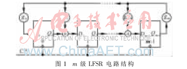 系统采用线性反馈移位寄存器(LFSR)[5]产生混沌序列Qm-1…Q1Q0,m级LFSR电路由m个D触发器和若干个异或门构成,在脉冲CP的上升沿到来时,输出m bit混沌序列Qm-1…Q1Q0,因LFSR的输出序列具有周期性,故被称作混沌伪随机序列。LFSR电路结构如图1所示,其中gi表示反馈系数,若反馈支路存在,则gi取值为1,否则gi为0。