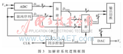 混沌音频加解密系统由同步控制模块、ADC模块、DAC模块、混沌序列发生模块、信号加密与解密模块及输出切换模块等组成。其中同步控制模块是系统加解密的关键,该模块产生3个分频脉冲fS、PEDC及PXOR,fS控制混沌序列的产生和音频信号的ADC转换,PEDC、PXOR分别触发加密和解密的启动。系统逻辑框图如图3所示。