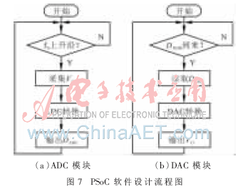 PSoC端完成音频信号的ADC和DAC转换,其开发环境是CYPRESS公司PSoC Creator 2.2,软件采用图形化编程方式,即从元件库中选择相应的模数器件进行配置,然后调用相关API函数。与传统的编程模式相比,该开发环境简化了大量底层代码的编写,缩短了项目开发周期。PSoC端软件流程如图7所示。