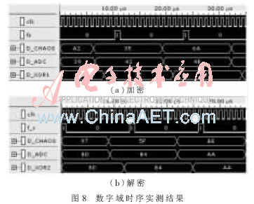 由于PSoC的ADC模块转换时间最快为10 μs,为使混沌序列DCHAOS与音频信号DADC保持同步,分频脉冲fS的周期应大于10 μs。本系统中FPGA时钟CLK周期设置为1 μs,分频脉冲fs、PEDC及PXOR的周期均为13 μs。对数字域内的加解密数据进行实测,其结果如图8所示。