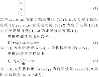 以三相星型二二导通无刷直流电机为例,假设磁路不饱和,三相绕组对称,忽略齿槽效应、涡流和磁滞损耗,分析其数学模型。电机定子绕组电压平衡方程表示为: