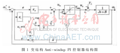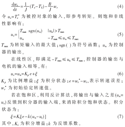 为了克服windup现象的产生,设计了Anti-windup PI 控制器,如图1所示。逻辑开关S在1、2之间切换,分别对应线性区与饱和区,对积分器进行控制。当控制器在线性区时,S与1相连,积分器累加转速误差;当控制器处于饱和区时,S与2相连,把控制器输出与被控对象输入之差反馈到积分器的输入端,消除积分饱和状态。