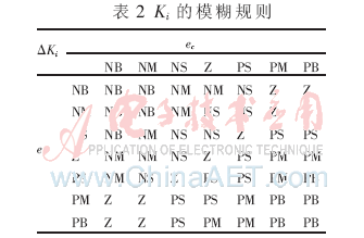 模糊控制器输入变量e及ec与输出变量Kp及Ki的模糊子集设定为{NB,NM,NS,Z,PS,PM,PB},并量化在区(-3,3)域内。根据大量模拟仿真实验和前人的电机控制经验,总结出了模糊控制规则集,见表1和表2,最终实现对PI参数的调整。