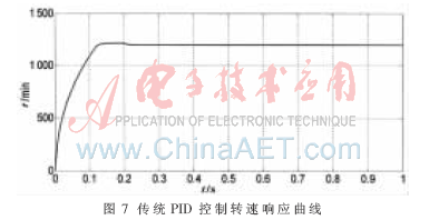 如图可知,实际波形与理论波形基本保持一致,证明该算法正确可行,系统能在直接转矩控制模型下稳定运行。下面与传统PID控制算法作比较, PID控制器的参数为:Kp=5,Kd=0.001,Ki=0.01。响应曲线对比如图6~图7所示。