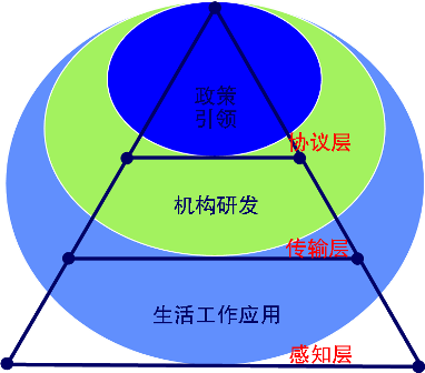 将射频识别、传感器、互联网联接则是构建物联网主要环节,为此取名为《感知中国》。而约定的协议,统一的标准是构建物联网最中心的一环。物联网底层是感知层,中层传输层(有线和无线),高层的协议层。中心一环的协议需要政策引领,中环需要机构研发与执行,外环的应用在大众生活与工作中。三网融合势在必行,三网融合是物联网初级目标。