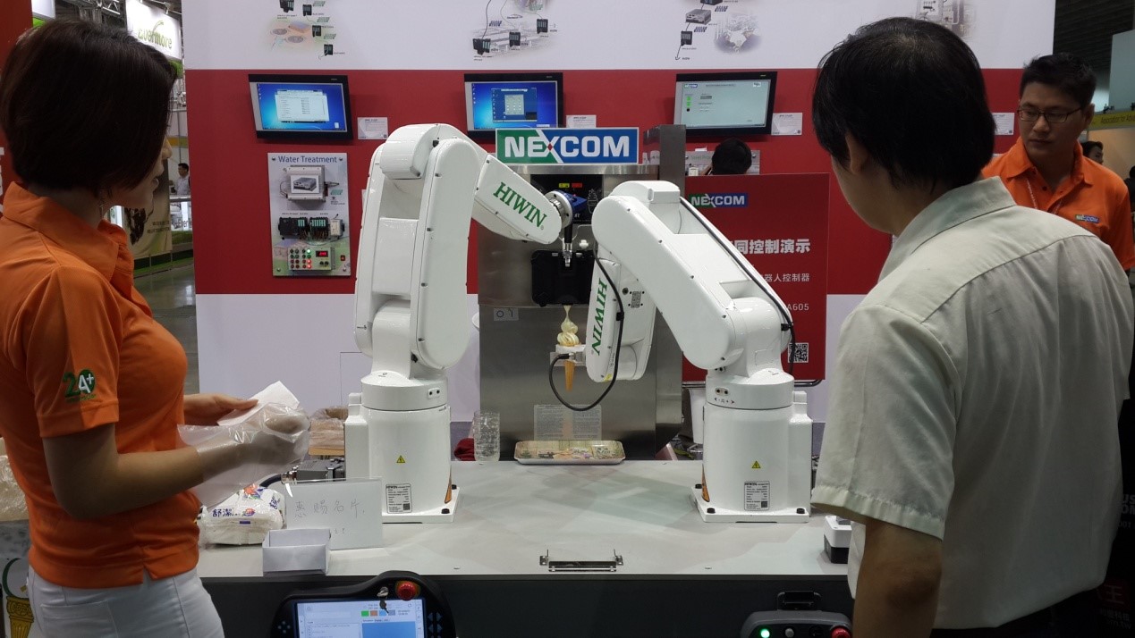 机器人动作需要复杂和高精度控制,为了使演示更容易理解,新汉安排了2个6R 机器手臂制作圆筒冰激凌分发给现场观众。机器人每天连续工作8小时,并将发放1000个圆筒冰激凌给现场观众,旨在诠释了在不久的将来,人机合作的可行性。