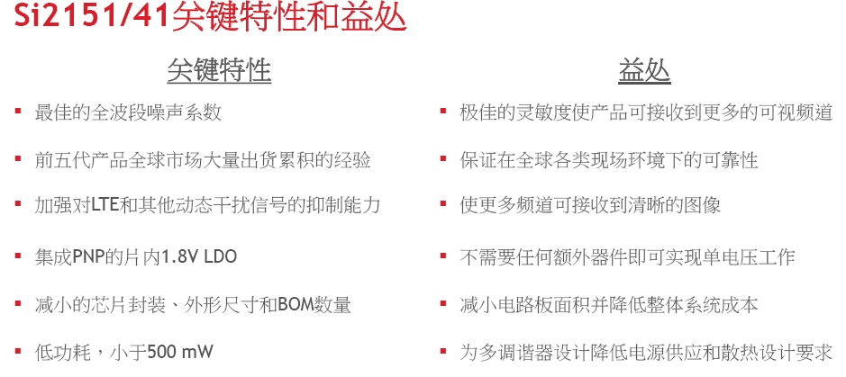Si2151/41电视调谐器采用3mm x3mmAFN封装,是当前市场上尺寸最小的电视调谐器IC,从而物料成本极低。同时具有卓越的线性度、灵敏度和极低的功耗,这些都有助于工程师提升电视和机顶盒设计。