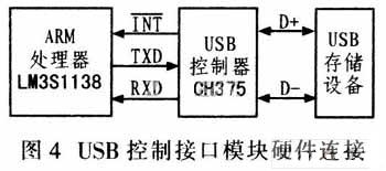 图4为USB控制接口模块硬件连接示意图,CH375通过UART串口与LM3S1138传输数据,*****为中断信号,TXD/RXD为数据传输串口,CH375连接USB存储设备。