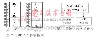 Micro2440开发板配有240×320/NEC3.5英寸T- FT真彩液晶屏,正确设置后能够显示清晰的图像、视频。S3C2440A的LCD控制器支持的屏幕大小包括480×640、240×320以及160×160等尺寸,能够产生VFRAME、VLINE、VCLK、VM等控制信号。这些控制信号的使用需要配置S3C2440A的C端口为LCD控制。同时LCD的数据线VD[0]~ VD[7]也由C端口控制,VD[8]~VD[23]则由D端口控制,需要设置做为LCD数据线。由于使用的是TFT真彩液晶屏,需要把LCD控制寄存器设置为TFT模式,这里设置为TFT的16BPP(Bits Per Pixel)模式;同时还需要对LCDCON5进一步设置为5:6:5或5:5:5:1格式,这里设置RGB格式为5:6:5格式,此信号在OV9650传输如图2所示[2]。以便和摄像头的视频输出格式相一致,否则需要进行格式的转化。在设置完帧缓存地址后,写入数据,便可以实现图像的显示,格式转换过程如图3所示。