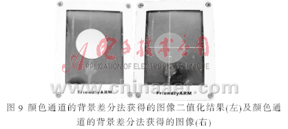 背景差为: fB(i,j)=f(i,j)-B(i,j)。此系统中RGB格式为5:6:5格式,红绿蓝分量均取5位,绿色分量舍弃了最低位。获得的差分图像分别以红色显示和二值化获得的结果如图8所示。