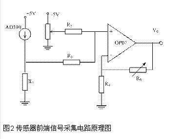 温度传感器采用AD公司的AD590芯片实现的,它是单片集成两端感温电流源。其电路原理图如图2所示,其中R1=5.1KΩ,R2=R3=10KΩ,R4=2KΩ,R5和R6分别选10KΩ的电位器。AD590受温度变化产生电流信号时,在电阻R1两端产生电势差,从而在运放输入端产生电压信号,由加法电路进行调节零点漂移;由运放OP07进行比例放大,放大倍数由电位器R6调节,使测试温度范围在0~65℃,输出电压相应为0~2.5V。