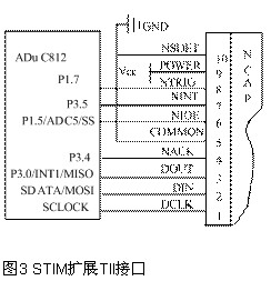 TII接口是硬件设计的重点,该接口不是一种额外的网络协议,而是连接NCAP和STIM的接口,主要定义二者之间的点对点连接,同步时钟的短距离接口。TII是基于SPI协议的串口通信接口,其中DIN,DOUT,DCLK和NIOE完成通讯功能,NTRIG和NACK实现与STIM有关的通道读写、触发和应答,STIM使用NINT信号要求从NCAP得到服务,NCAP使用NSDET信号检测STIM模块,实现STIM的即插即用。系统采用ADUC812的SPI总线和其它的I/O资源来模拟实现TII十线接口。连接示意图如图3所示。为了实现STIM模块的热插拔,需对TII接口的供电电源进行处理,可以在STIM方面加入热插拔保护电路,当然也可以在NCAP方面加入保护电路。本系统在NCAP方面加入了保护电路。